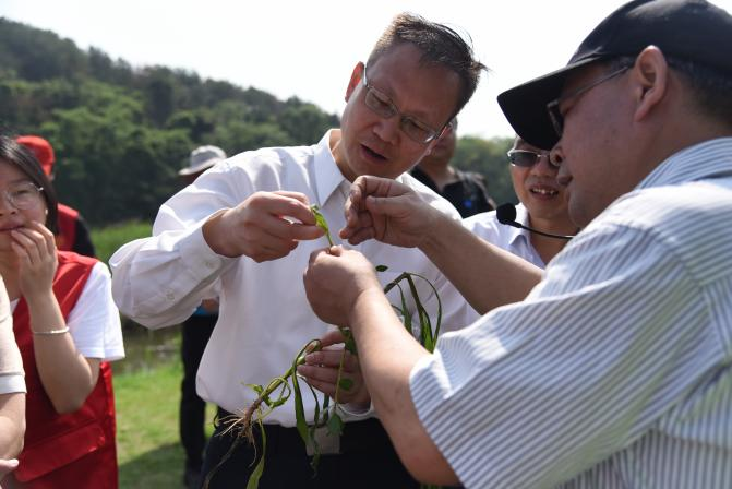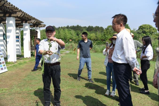 在对节白蜡园旁,太阳集团122cc李兆华教授介绍了在藏龙岛国家湿地公园调查到的4种国家保护植物和5种外来入侵物种。李教授以园内的入侵植物加拿大一枝黄花为例,讲解了加拿大一枝黄花的识别方法,并与现场人员进行交流讨论,呼吁群众积极参与生物多样性的保护与外来入侵物种的防治。
