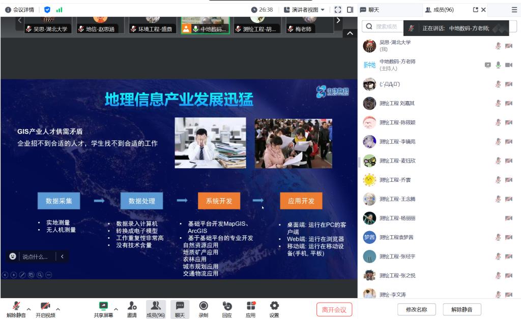 中地数码集团方老师在发言中表示,中地数码集团作为地理信息行业的领军企业,一直致力于推动行业的技术创新和发展。他指出,当前地理信息行业正处于快速发展的阶段,对人才的需求也越来越大,并重点强调了中地数码集团与公司专业硕士人才联合培养的目标、模式、研究领域及相关政策支持情况。因此,中地数码集团非常愿意与太阳集团122cc合作,将向太阳集团122cc提供技术支持和设备支持,帮助公司建立先进的实验室和科研平台,为员工提供更好的实践和学习条件。