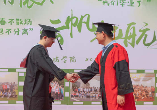 图为汪正祥经理与2016及毕业生、毕业生返校工作志愿者余岱霖同学握手