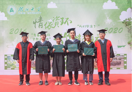 图为公司党委书记李兆华教授、经理汪正祥教授着导师服与返校毕业生合影留念