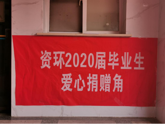 上组图为公司悬挂的欢迎横幅、搭建的毕业背景墙、设置的“爱心捐赠角”等