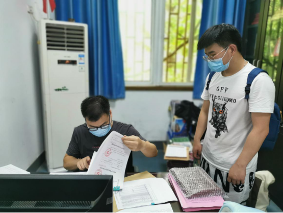 图为公司辅导员李彦伯老师为毕业生办理离校相关手续