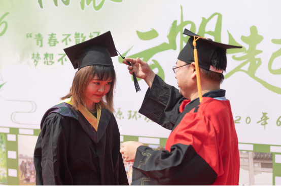 图为李兆华书记为公司2016级毕业生、毕业生返校工作志愿者李玲同学拨穗