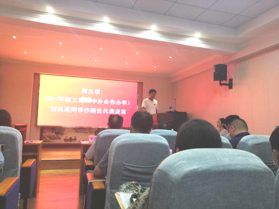 见面会第五项,2021级环境工程(中外合作办学)胡兆廷同学作为新生代表发言,他通过分享自身成长、奋斗的经历,号召同学们把握好、珍惜好大学的美好时光,在大学这段旅途中全力以赴,不留遗憾,交出一份让自己满意的青春答卷。