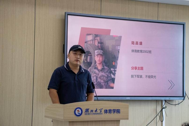 陆昌盛学长通过视频与现场讲述结合,回顾了自己从老员工到军人的转变,并介绍了退役后担任军训教官、参与家乡防汛志愿服务的经历,展现了军人本色在校园与社会的延续。