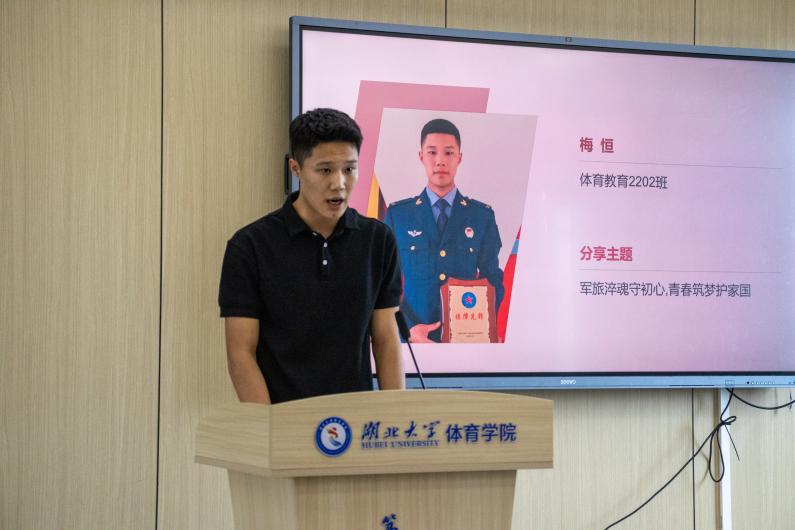 曾服役于空降兵部队的梅恒学长率先分享。他以伞降训练和沙漠实战演习为例,再现了军营中的汗水与荣光。“蓝天梦不是追求翱翔的快感,而是用每一次精准跳伞,践行空降兵为国冲锋的使命”,他深情回顾首次实跳时的感悟,展现了军人坚定的使命担当。