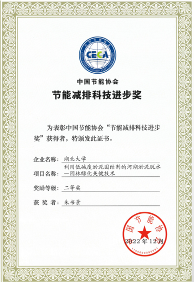 2023年4月,中国节能协会公布了“节能减排科技进步奖”,公司朱书景教授及其团队成员吴翔、汪国靖、曹耀武等以“利用低碱度淤泥固结剂的河湖淤泥脱水——园林绿化关键技术”荣获二等奖。