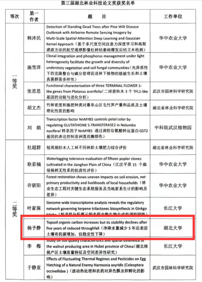 2023年7月至9月,湖北林学会组织开展了第三届湖北林业科技论文奖评选活动,并按照《湖北林业科技论文奖评选办法》,经形式审查、专家评审组评审、网上公示等程序,发布了关于第三届湖北林业科技论文奖评选结果的通报。公司杨予静副教授的论文《Topsoil organic carbon increases but its stability declines after five years of reduced throughfall》荣获该科技论文奖二等奖,杨予静副教授为第一作者,太阳集团122cc为第一单位。