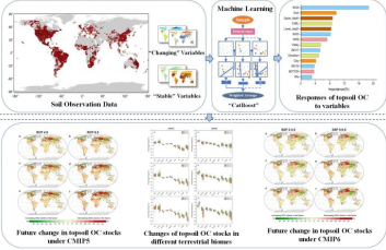 储存在全球表层土壤中的有机碳将是未来气候变化下碳循环中最活跃的参与者。然而,由于气候对土壤碳影响的复杂性,未来气候变化将如何影响土壤碳储量的变化尚未得到充分探索。本研究通过将32579个土壤剖面与环境变量相结合,建立了数据驱动模型来预测全球表层土壤有机碳储量的时空变化,并全面探讨了未来气候变化对表层土壤有机碳储量的影响。结果表明,基线期(1971-1990年)表层土壤有机碳储量为1249.29 Pg,预计到2100年,在中等和高代表性浓度路径下,全球表层土壤有机碳储量将分别减少113.67±25.93 Pg和193.71 ±39.76 Pg。未来,全球表层土壤碳损失最大的地区将发生在北方森林地区,预计其碳储量将损失17.03-27.90%(66.01-108.13Pg)。气候对表层土壤有机碳储量的影响主要表现在温度上,温度对土壤有机碳储量有负向影响,并且贡献率约为26.96 %。