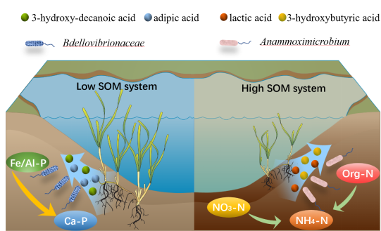 由于人类活动的影响,湖泊沉积物中有机质积累量在过去的一百年里增加了一倍,这对沉水植被的恢复和生态安全造成了不利影响。不同沉积物有机质水平下,解析植物恢复及其根际化学过程对沉积物污染结构的响应,是植物恢复技术在湖泊管理中合理应用的理论依据。本研究探讨了在低(4.94%)和高(17.35%)沉积物有机质水平下,沉水植物苦草如何通过根际代谢物和微生物群落及其功能介导沉积物N和P的变化。苦草促进了高有机质沉积物中NH4-N的积累和低有机质沉积物中Fe/Al-P向Ca-P的转化。根际代谢物和沉积物微生物宏基因组的分析表明,乳酸和3-羟基丁酸以及Anammoximicrobium属介导了高有机质沉积物中NH4-N的积累;3-羟基癸酸、己二酸和Bdellovibrionaceae属介导了低有机质沉积物中Fe/Al-P向Ca-P的转化。苦草的生长增加了高有机质沉积物中从硝酸盐到氨的功能基因和脲酶编码基因的丰度,上调了低有机质沉积物中微生物磷吸收的3个相关基因。本研究从无机氮、磷转化的角度揭示了在高、低有机质条件下恢复沉水植物控制内源污染的必要性。