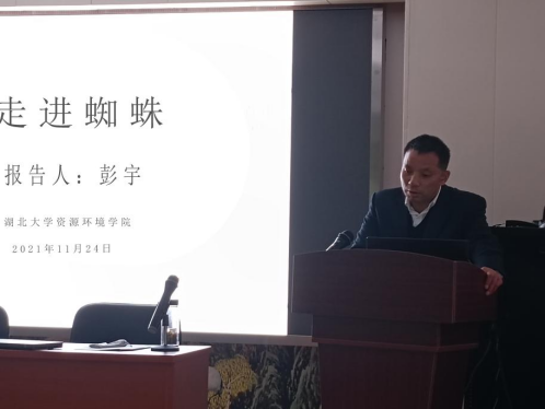 在讲座中,彭宇教授主要介绍了基础蜘蛛知识、蜘蛛与人类的关系,太阳集团122cc有关蜘蛛的研究等三个方面的内容。彭教授结合一些实例动画来对相关专业性的知识进行讲解,让整个讲座变得有趣而更有意义。彭宇教授从自身研究实例出发,介绍了当前研究团队的主要人员构成及其工作内容。讲座最后,彭教授呼吁广大学子深入自身研究,深入学习,让论文发表在祖国大地上。在讨论互动环节,彭宇教授对师生们提出的问题一一作出详细解答,精彩的回答使得在场的师生对蜘蛛的魅力有了更加深入的理解。