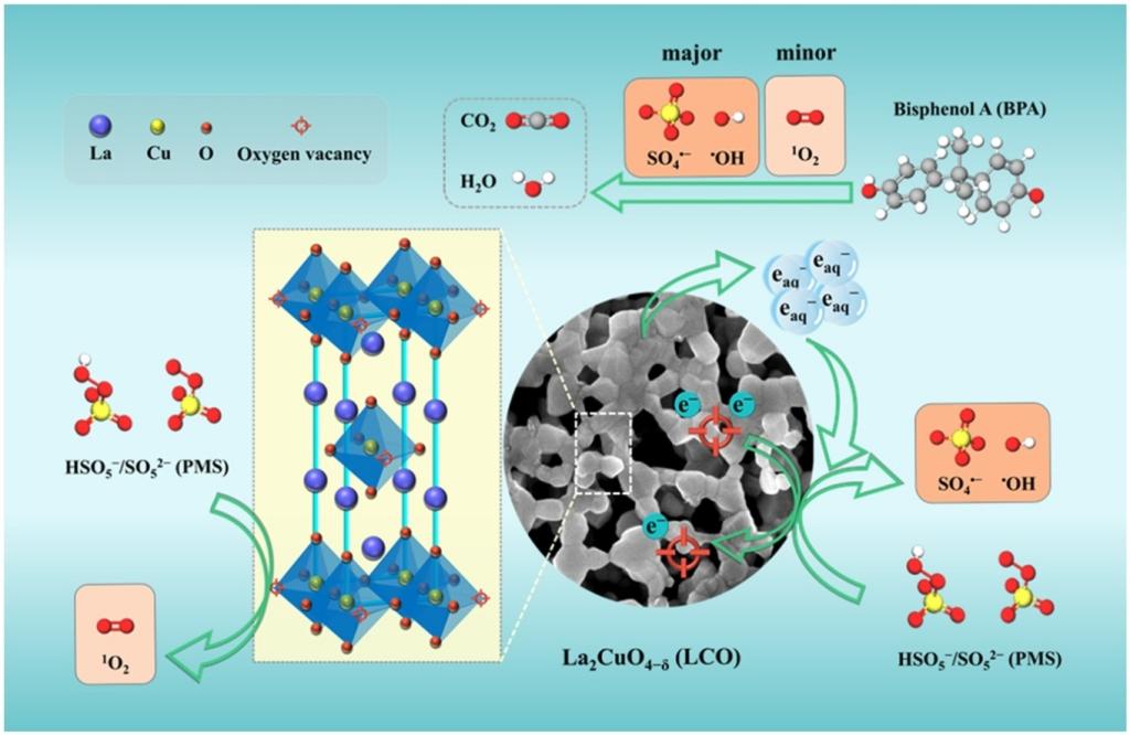 当前,为减轻甚至消除日益严重水污染问题,亟需开发高效、低成本和环境友好的新兴水处理技术。近年来,基于硫酸根自由基的非均相高级氧化技术引起了广泛的关注,其技术核心在于高性能异相催化剂的设计以及界面催化机制的揭示。针对上述问题,该论文制备了一种具有良好低温还原性、富表面氧物种及氧空位的钙钛矿氧化物(La2CuO4-δ, LCO),并成功应用于活化过硫酸盐高效降解水中内分泌干扰物双酚A(BPA)。研究发现,与传统的以氧化物表面不同价态过渡金属离子(Mn+)为活性位点的反应机制不同,本论文提出一种界面活化新途径,即钙钛矿氧化物表面富含局域电子的氧空位可以通过单电子转移或者产生水合电子(eaq−)等方式,直接活化过硫酸盐产生吸附态硫酸盐自由基(SO4•−)和羟基自由基(•OH)等强氧化性物种,降解有机污染物BPA。此外,文章还揭示了BPA的降解历程和转化机理,并证实LCO/PMS体系具有较高的实际应用潜力,能在不同实际水体中有效降解BPA。相关研究为高效非均相催化剂的制备,及其催化氧化去除有机污染物的广泛应用提供技术支撑与理论指导。