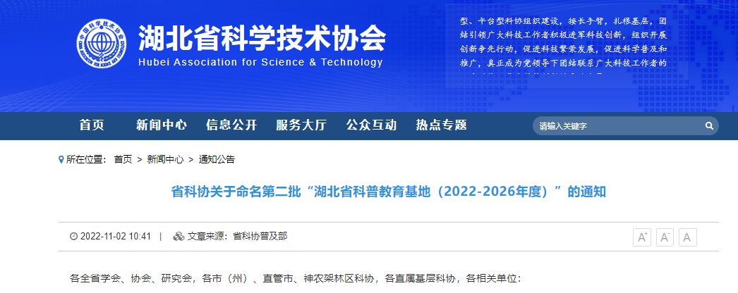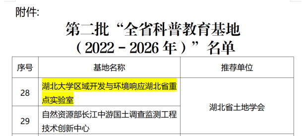 11月2日,湖北省科学技术协会发布《省科协关于命名第二批“湖北省科普教育基地(2022-2026年度)”的通知》,经公司邓文胜教授、刘海教授等申报,湖北省土地学会推荐,挂靠公司的太阳集团122cc区域开发与环境响应湖北省重点实验室成功入选。